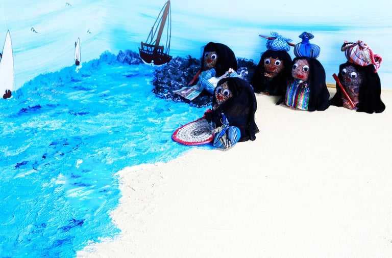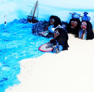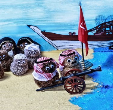 And oh Al-Jabrit, bring Muhammad Al-Afreet. Muhammad Al-Afreet mentioned in the song is the son of the late Sabtwa, may God have mercy on her, the well-known woman who used to work as a tob tob ya bahr in the past. What is meant by the “afreet” is (the devil). After the late Sabtwa came another woman, the late Aliya Al-Ba’arki, who was blind and she was the last woman who used to work as a tob tob ya bahr in the era of Sheikh Ahmad Al-Jaber, may God have mercy on him. Hussein bin Ali and Shamlan were mentioned - Al-Rumi Rashid bin Ahmad, the pearl diving prince - Abu Nayan - Abu Rasli - Al-Mannai Abu Qamaaz, who were pearl diving merchants and captains in the past. The purpose of this song is to frighten the sea, discipline it and threaten it, because it is the reason for their separation from their families, which lasted for days and nights. They believe that by frightening it, their families will return safe and sound, bearing pearls and good things, carrying. The reason for them carrying burning palm fronds is a funny reason that calls for strangeness!! This is why they express all their feelings, emotions, separation, etc. in their chests and hearts. They used to beat the sea and burn it with fire (cauterization) so that it would feel the anguish they felt and the pain of separation. They would take a cat with them, put a piece of misham around its neck, and one of the women would dip it in the sea several times with the intention of defiling the sea with it. It would scream (miaw miaw miaw) and all the women would respond, “Yaw yaw yaw” (meaning they came... they came).