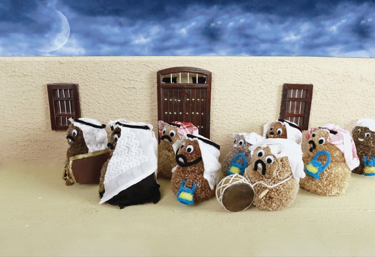 Kuwaiti heritage researcher Dr. Yaqoub Al-Ghunaim said that Gargee'an is a popular word that means a mixed and varied dish consisting of mixed nuts and some sweets. It is also said that the name is derived from the word "Qarq'a," which means making sounds from solid materials, such as the sound of iron pots carrying sweets and some drums played by children. Dr. Al-Ghunaim added that the Gargee'an market used to begin in the candy market located in the middle of Kuwait's traditional markets, where shop owners would display their goods in their windows due to people's eagerness to buy. He explained that Gargee'an was a favorite occasion for children in the past, who would eagerly await it and prepare for it in neighborhoods and alleys, knocking on doors and houses opening to receive them. They would gather in groups of boys and girls, separately. He mentioned that the boys would repeat (Gargee'an, oh God, keep their son safe, oh God), while the girls would repeat (Gargee'an, oh short verse, oh Ramadan). Families and people would take care to prepare for Gargee'an and share their feelings of joy with the children and instill a spirit of intimacy among people. Mothers would sew Gargee'an bags from burlap, excess cloth, or remnants of old clothes and hang them around the neck, known as (the map), to collect what the people would distribute. He indicated that in the past, it was not only children who (gargee'an), but also some young men who carried drums and tambourines, and spontaneous, funny disputes would often break out between them on one hand and the children on the other. The researcher in astronomical folklore, Adel Al-Saadoun, says that after the iftar period is over, they start moving around the neighboring houses wearing traditional clothes, where the girls wear the dir'a and the bukhnq and decorate themselves with some henna. Al-Saadoun added that the boys would wear the dishdasha, some of them would wear the ghutra, and some would wear a light jacket. They would carry a cloth bag that was hung around their necks. Some of them would carry drums, empty boxes, and copper pots and would beat them with a stick or a stone to get the Gargee’an (May you return to it every year and fast it). Gargee’an has different names among children in the Gulf countries, including (Gargee’an - Garangao - Garanqasho) in Kuwait and Saudi Arabia, (Gargee’an) in the Sultanate of Oman, and (Haq al-Layla) in the Emirates.