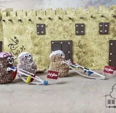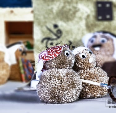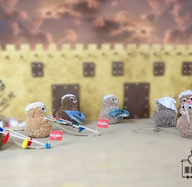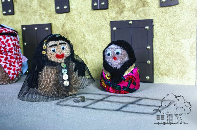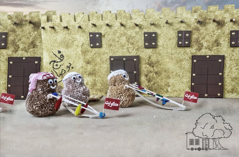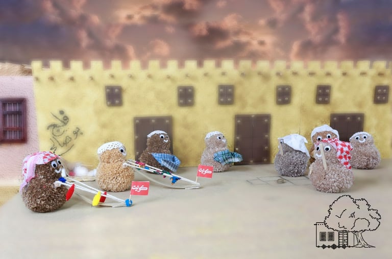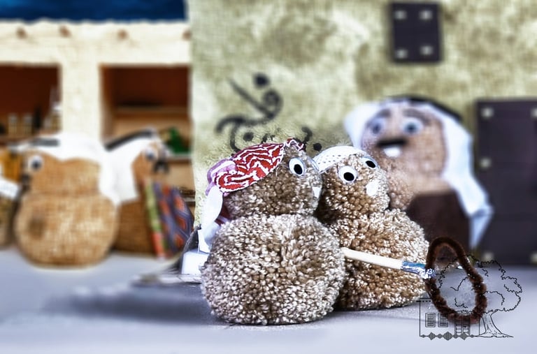 As Kuwaitis know it, it's a palm stick stripped of its fronds and thorns. This stick is straight at the top and curved at the bottom, with a wide end. It's used as a fun toy for children, and some children are creative in decorating it. When a child receives it, they bend it and connect its two ends with a strong, taut thread, further curving it. They then take scraps of worn-out colored fabric and attach them along the thread. Some people tie a small stick at its upper end, called a "sakkan," and another at its lower end, connecting them with decorative threads, creating a beautiful, colorful shape. They hold it by the upper stick and strut around the streets, strutting with swagger.