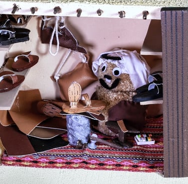 Leather beads and the like Kharaz: he sewed, beaded: and decorated it with bead and beaded Al-Khirazah: the craft of the beader, and one of his crafts is sewing leather. It is an old popular craft that is still widespread to this day. The beader is a craftsman who deals with leather with skill and turns it into something useful that we can use in our daily lives. The beader produces a number of necessities such as: slippers, water skins (for storing water), milk jugs (saqqa), oil cans, rifle shelters, and belts. The tools are: leather that they bring from different regions, the most important of which are tanneries, and they select it well in terms of cleanliness and quality - a large needle with a round wooden handle - thick colored threads to decorate the sole or other products - a pestle to beat the leather - a samba, which is a rectangular piece of wood about 15 cm long, pointed on one side and gradually increasing in thickness - a mahkha, which is a piece of rough stone - scissors and knives