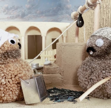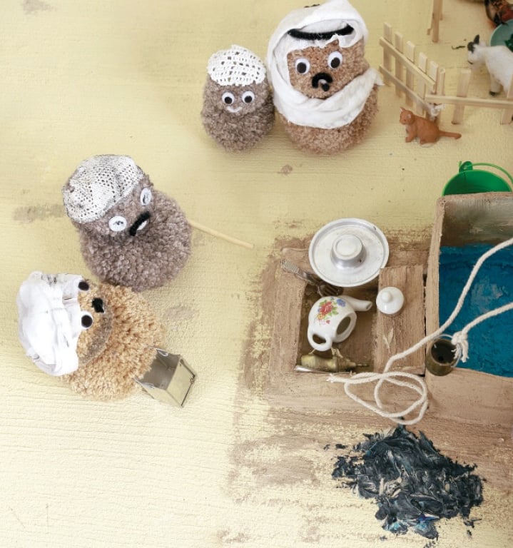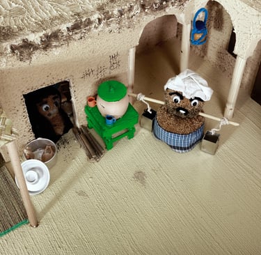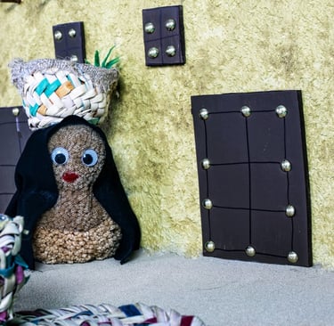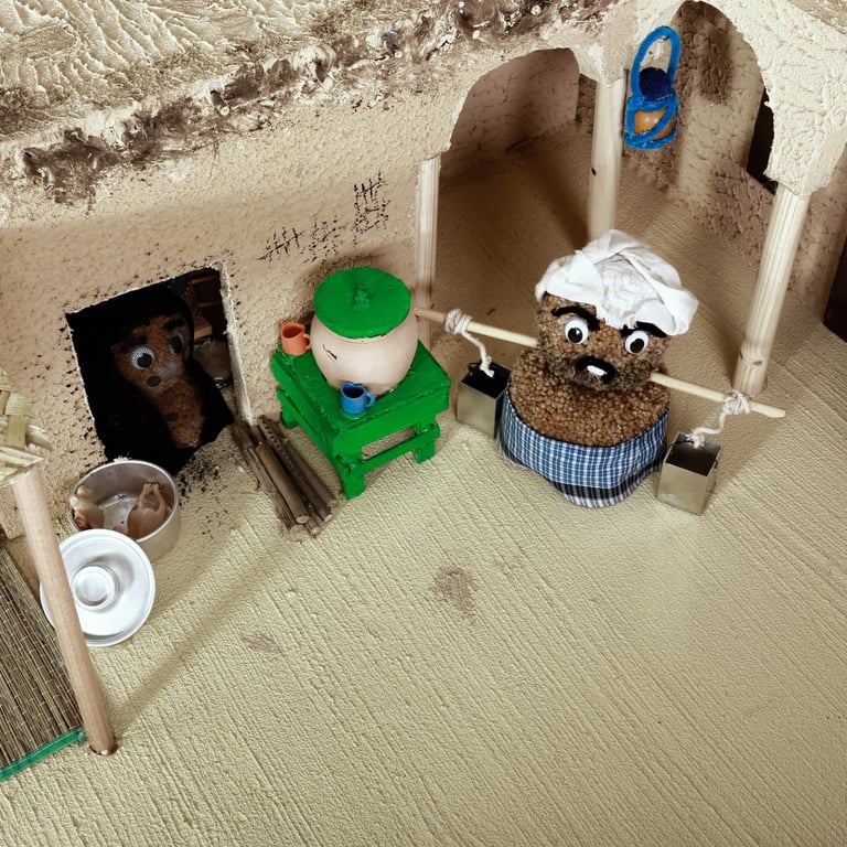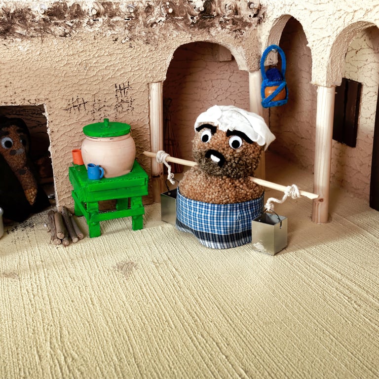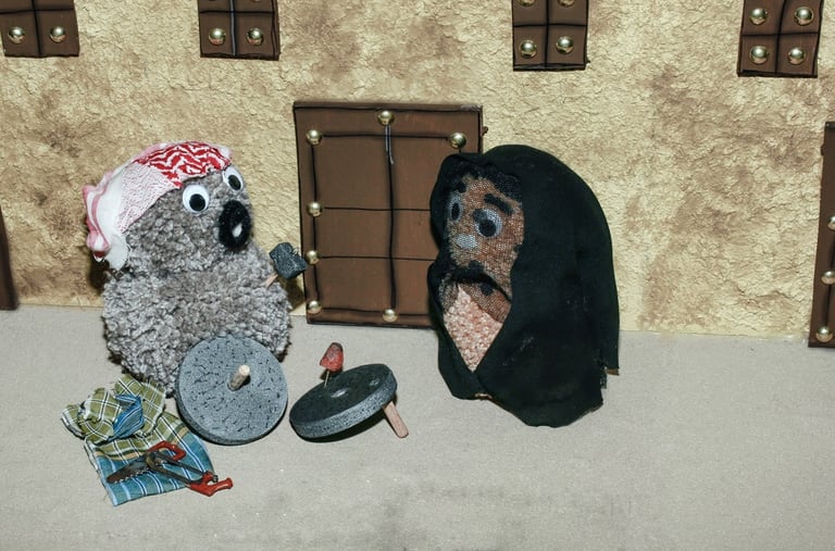 He is the person who passes by the houses calling (Nakkas ... Nakas) to repair the millstone, which is two pieces of stone, the upper piece has a hole to put the wheat grains in it and is operated by a piece of wood fixed at the top to move it. It was used to grind wheat (jarish) in the past. The lady of the house in the past would hand him the millstone which, due to frequent use, had become soft and did not grind the wheat. When it was handed over to the Nakas, he would roughen the millstone and repair it using the tools he carries with him in a bag, which are hammers, judoum, fine rhiz, and mishartin. He would turn the millstone over by roughening it by tapping and banging on it so that it would have teeth that would be useful in grinding what was thrown into it.